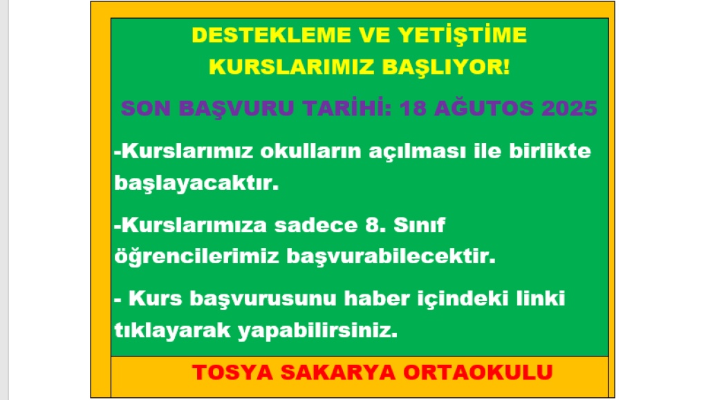 Destekleme ve Yetiştirme Kurslarına başvurular 4 - 18 Ağustos tarihleri arasında SADECE 8. Sınıflar için alınacaktır. Son güne bırakmadan başvurunuzu mutlaka gerçekleştiriniz. Kurslar okulların başlaması ile birlikte başlayacaktır.